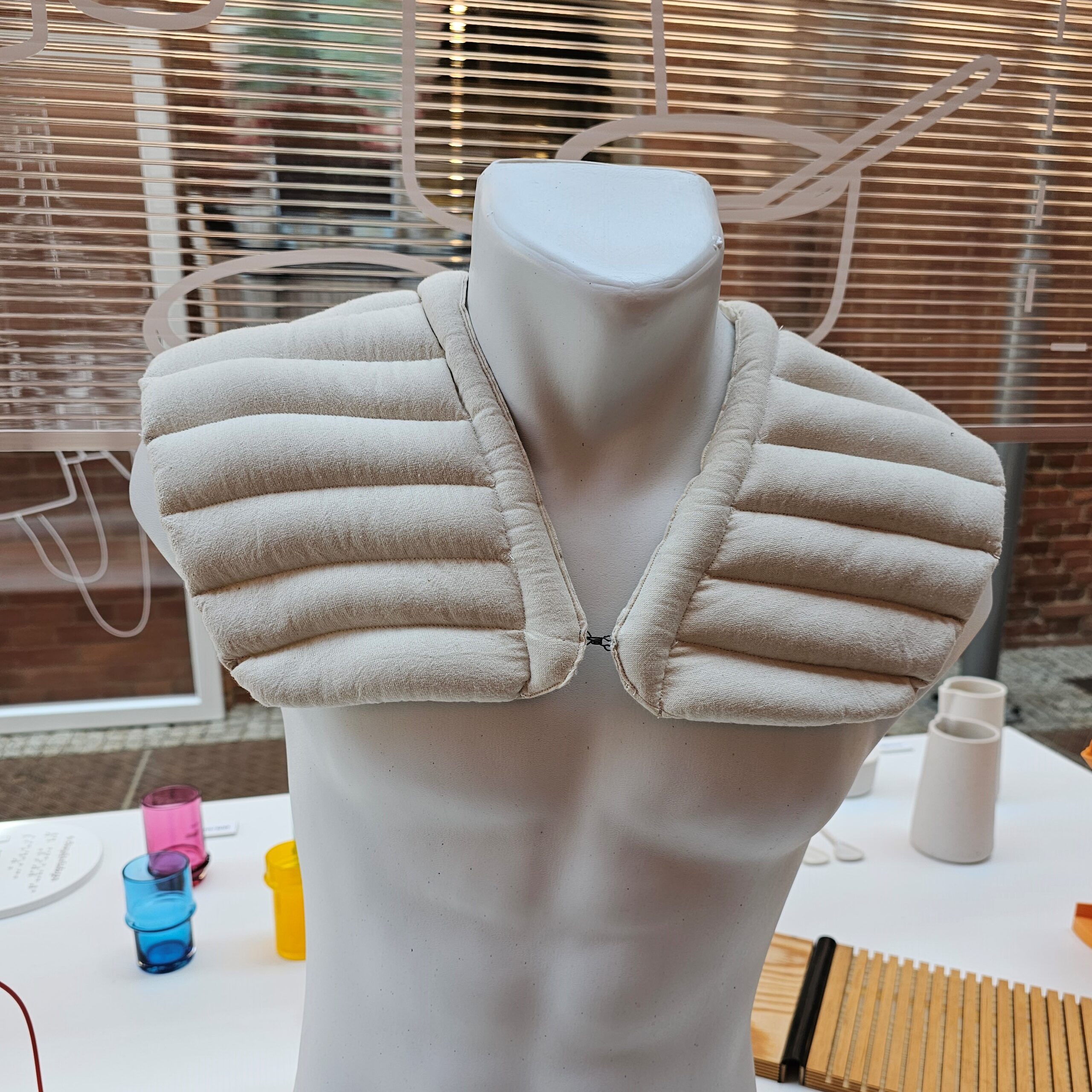 Kameralna wystawa „Migracje” Joanny Jurgi poruszyła mnie chyba najbardziej. Bada temat poczucia bezpieczeństwa podczas przemieszczania się migrantów. Oglądamy m.in. ciepłą bluzę z suwakiem do łatwego karmienia piersią, gdy jest zimno. Wzrusza prosty ochraniacz zabezpieczający przez uszkodzeniem fizyczne zdjęcia bliskich. Zachwyca idea przenośnego stoliczka do wspólnego spożywania posiłków w niesprzyjających okolicznościach. „W dobie kryzysu klimatycznego i konfliktów zbrojnych migracje nabierają nowego znaczenia. Bank światowy szacuje, że do 2050 roku swój dom opuści 216 milionów ludzi”.
